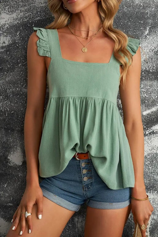 Experience feminine charm with our Baby Doll Tank. Embrace the romantic ruffled sleeves and square neckline of this flowy top, designed with back button closures for easy wear. Crafted from 70% viscose and 30% linen, it offers comfort and style in one. Perfect for any occasion.